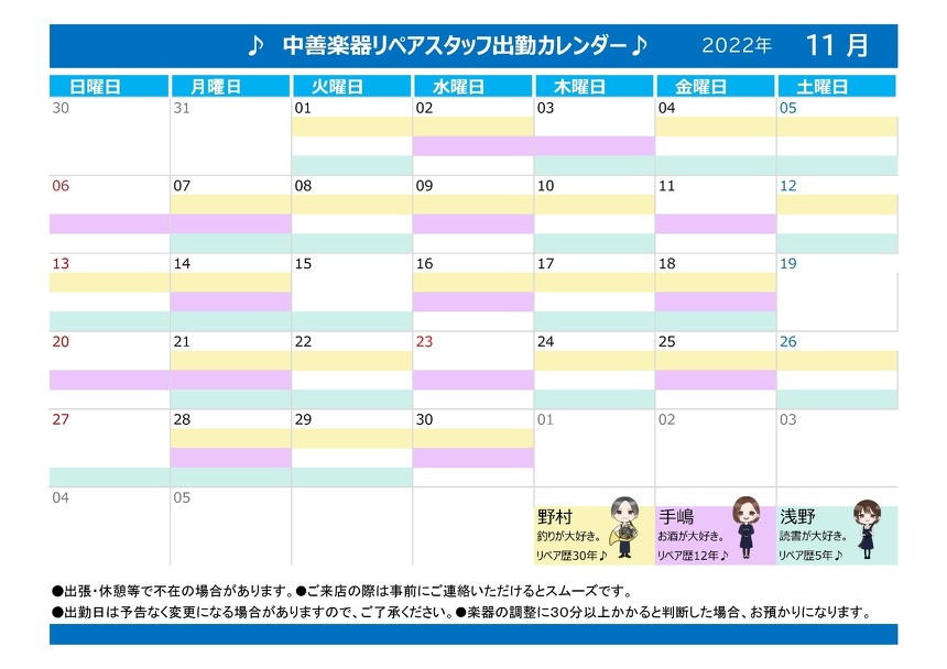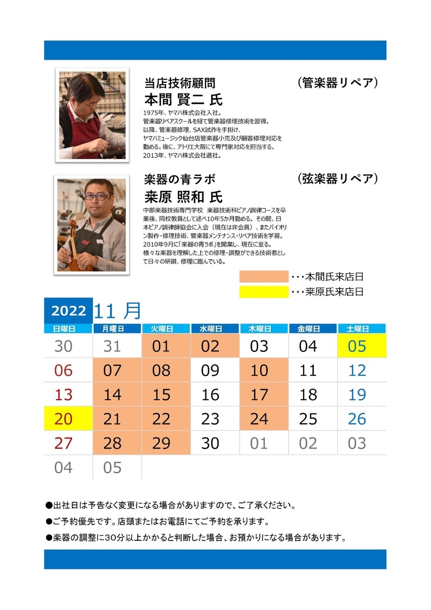 2022.10.26お知らせ 管楽器・弦楽器技術者カレンダー 2022年11月 管楽器の修理は当店へお任せ下さい。 経験豊富な技術スタッフが丁寧にご相談いたします。 当店の楽器修理受付は、予約制ではございません。 ご来店頂いた順にお受付しておりますので、まずは、楽器を持ってご来店ください。 受付にて、ご希望の修理調整内容をお聞かせ頂きながら、楽器の状態を確認し、修理完了までの段取りをお客様と一緒にご相談させて頂きます。 ※技術スタッフが不在の場合や修理内容によって は楽器をお預かりする場合がございます。