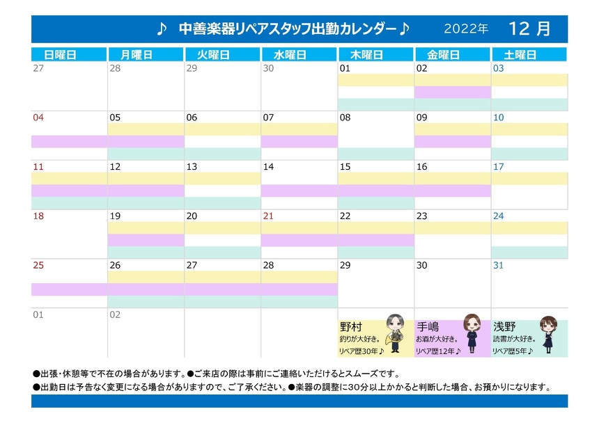 2022.11.28お知らせ 管楽器・弦楽器技術者カレンダー 2022年12月 管楽器の修理は当店へお任せ下さい。 経験豊富な技術スタッフが丁寧にご相談いたします。 当店の楽器修理受付は、予約制ではございません。 ご来店頂いた順にお受付しておりますので、まずは、楽器を持ってご来店ください。 受付にて、ご希望の修理調整内容をお聞かせ頂きながら、楽器の状態を確認し、修理完了までの段取りをお客様と一緒にご相談させて頂きます。 ※技術スタッフが不在の場合や修理内容によって は楽器をお預かりする場合がございます。