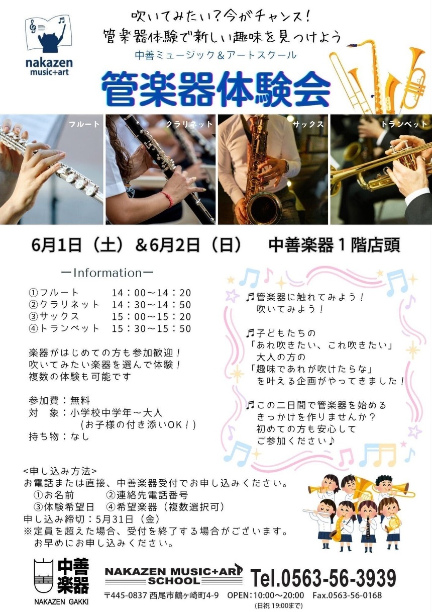 2024.05.17イベント 管楽器体験会のお知らせ 2024.6.1-2 中善ミュージック&アートスクール 管楽器体験会のお知らせ 6月1日(土)2日(日) 両日開催 14:00~14:20 フルート 14:30~14:50 クラリネット 15:00~15:20 サックス 15:30~15:50 トランペット はじめてのかた大歓迎!手ぶらでOK! 吹いてみたい楽器を選んで体験いただけます。 参加費は無料です。 お申込みはお電話にて受け付けております。 お名前・お電話番号・体験希望日・希望楽器をお知らせください。