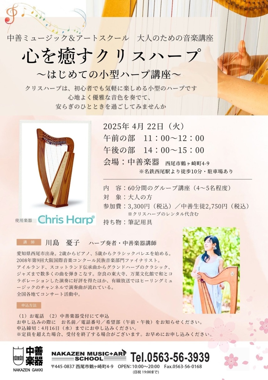 講 師 川島 憂子(ハープ奏者 中善楽器講師)