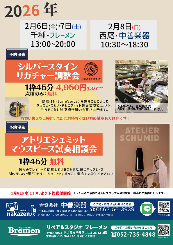 シルバースタイン調整会&アトリエシュミットクラリネットマウスピース試奏会のお知らせ