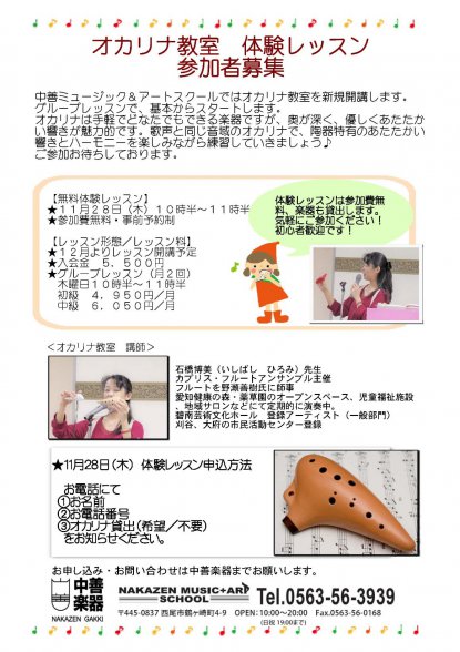 | 体験レッスン申込方法 | お電話にて ①お名前 ②お電話番号 ③オカリナ貸出(希望/不要) をお知らせください。 |