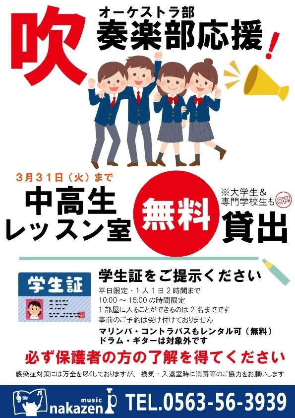 吹奏楽部、オーケストラ部応援!レッスン室無料貸出【3月31日までの平日限定】