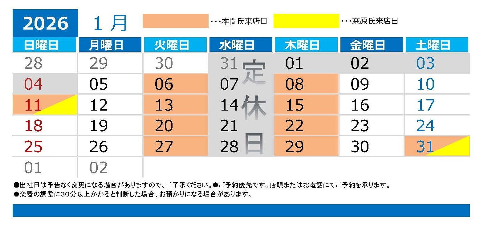 ※技術スタッフが不在の場合や修理内容によって は楽器をお預かりする場合がございます。